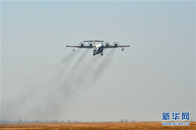 “鯤龍”AG600在珠海金灣機(jī)場(chǎng)起飛(2017年12月24日攝)。新華社記者 梁旭 攝