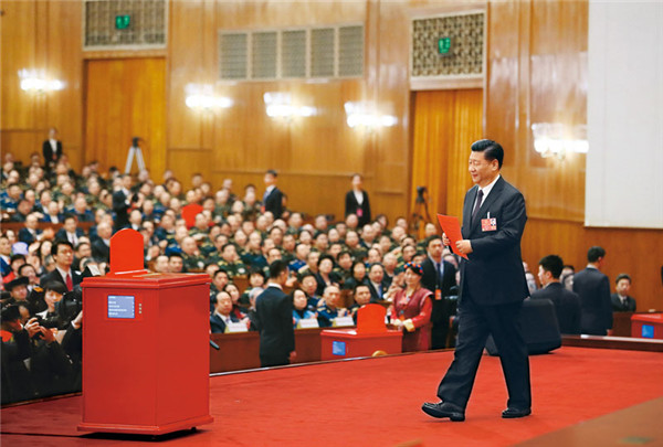 2018年3月17日,十三屆全國人大一次會議在北京人民大會堂舉行第五次全體會議。習(xí)近平當(dāng)選中華人民共和國主席、中華人民共和國中央軍事委員會主席。這是習(xí)近平準(zhǔn)備投票。 新華社記者 蘭紅光/攝