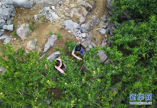 農(nóng)民在貴州省印江縣朗溪鎮(zhèn)昔蒲村的石漠化治理區(qū)采摘桃子(6月26日無人機拍攝)。 近年來,貴州省圍繞產(chǎn)業(yè)選擇、培訓農(nóng)民、技術(shù)服務、資金籌措、組織方式、產(chǎn)銷對接、利益聯(lián)結(jié)、基層黨建等“八要素”,通過“減、融、服”創(chuàng)新推進農(nóng)村產(chǎn)業(yè)結(jié)構(gòu)調(diào)整,既帶動了農(nóng)戶增收,也推動了特色產(chǎn)業(yè)做大做強。 新華社記者 楊文斌 攝
