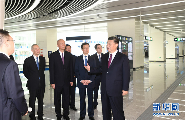 9月25日上午,北京大興國際機(jī)場投運(yùn)儀式在北京舉行。中共中央總書記、國家主席、中央軍委主席習(xí)近平出席儀式,宣布機(jī)場正式投運(yùn)并巡覽航站樓。這是習(xí)近平在綜合交通中心聽取機(jī)場綜合交通體系建設(shè)情況介紹。 新華社記者 謝環(huán)馳 攝
