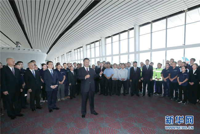 投運(yùn)儀式結(jié)束后,習(xí)近平來到機(jī)場國際出發(fā)大廳,看望參與機(jī)場建設(shè)和運(yùn)營的工作人員代表。習(xí)近平同大家一一握手,代表黨中央向大家并向所有參與機(jī)場規(guī)劃、建設(shè)、運(yùn)營的同志們表示熱烈的祝賀和節(jié)日的問候。習(xí)近平指出,大興國際機(jī)場建設(shè)標(biāo)準(zhǔn)高、建設(shè)工期緊、施工難度大,全體建設(shè)者辛勤勞動、共同努力,高質(zhì)量地完成了任務(wù),把大興國際機(jī)場打造成為精品工程、樣板工程、平安工程、廉潔工程,向黨和人民交上了一份令人滿意的答卷!