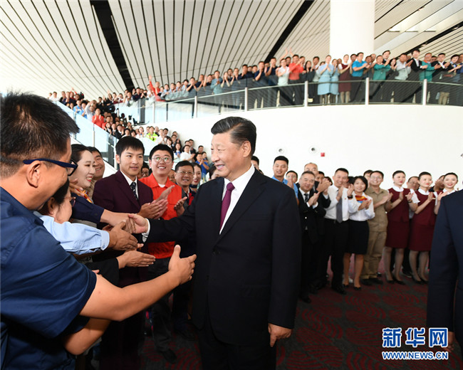 9月25日上午,北京大興國際機(jī)場投運(yùn)儀式在北京舉行。中共中央總書記、國家主席、中央軍委主席習(xí)近平出席儀式,宣布機(jī)場正式投運(yùn)并巡覽航站樓。這是習(xí)近平看望參與機(jī)場建設(shè)和運(yùn)營的工作人員代表,同他們親切交談。 新華社記者 王曄 攝