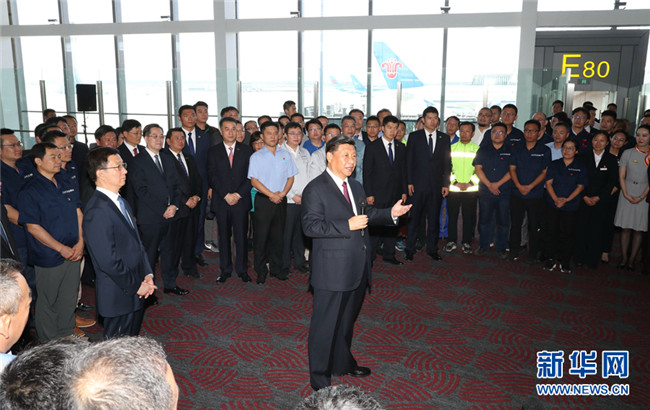 值機(jī)柜臺前,習(xí)近平察看智能技術(shù)、全自助無紙化智慧值機(jī)的流程,對機(jī)場采用現(xiàn)代化設(shè)施為旅客提供便利服務(wù)的做法表示肯定。他強(qiáng)調(diào),既要高質(zhì)量建設(shè)大興國際機(jī)場,更要高水平運(yùn)營大興國際機(jī)場。要把大興國際機(jī)場打造成為國際一流的平安機(jī)場、綠色機(jī)場、智慧機(jī)場、人文機(jī)場,打造世界級航空樞紐,向世界展示中國人民的智慧和力量,展示中國開放包容和平合作的博大胸懷。