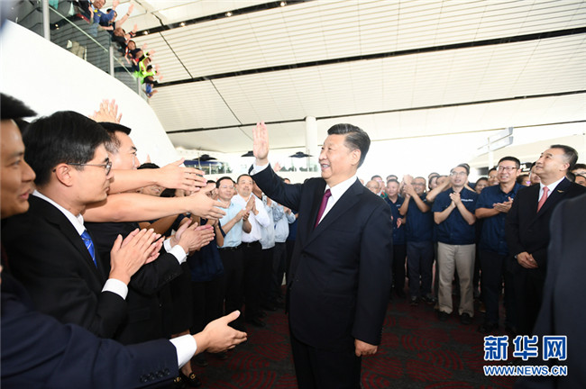 投運(yùn)儀式在機(jī)場聯(lián)檢大廳舉行。11時許,伴隨著歡快的迎賓曲,習(xí)近平等步入儀式現(xiàn)場,全場起立鼓掌。