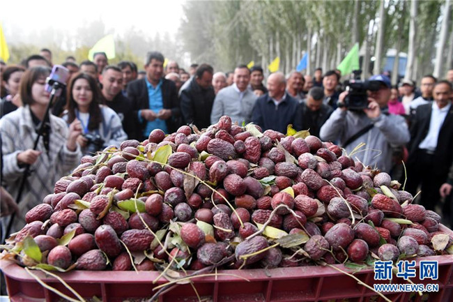 當日,新疆且末縣英吾斯塘鄉(xiāng)阿瓦提村有機紅棗園開展紅棗采摘及直播代言活動,通過在棗園舉行打棗儀式、客人現(xiàn)場采摘等活動慶豐收。 新華社記者沙達提攝