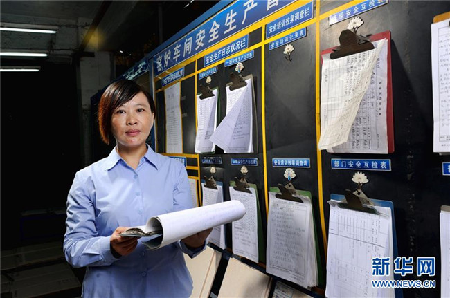 首批農(nóng)民工全國(guó)人大代表之一胡小燕在曾經(jīng)工作過(guò)的陶瓷廠檢查職工權(quán)益保護(hù)工作(2013年11月5日攝)。新華社記者 劉大偉 攝
