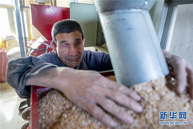 馬騰俊在用手測試麥子的好壞(10月25日攝)。 新華社發(fā)(楊植森 攝)