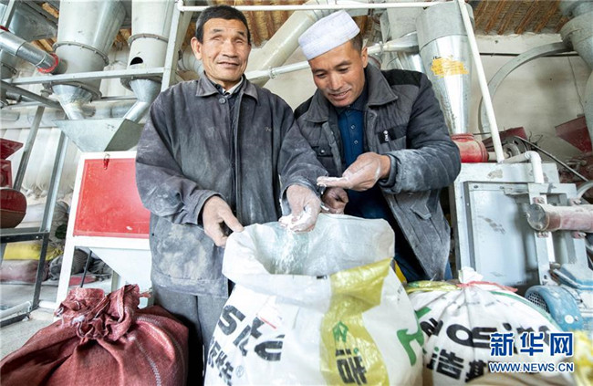 馬騰俊(左)和前來磨面的當(dāng)?shù)卮迕窆餐瑱z查新磨出的面(10月25日攝)。 新華社發(fā)(楊植森 攝)