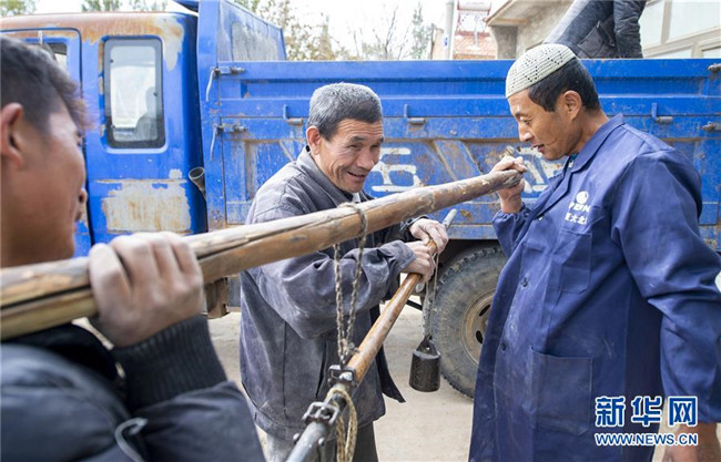 馬騰俊(中)在觸摸秤桿讀取面粉的斤數(shù)(10月25日攝)。新華社發(fā)(楊植森 攝)