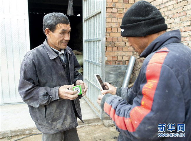 馬騰俊(左)正在用二維碼收取磨面的加工費(fèi)(10月25日攝)。 新華社發(fā)(楊植森 攝)