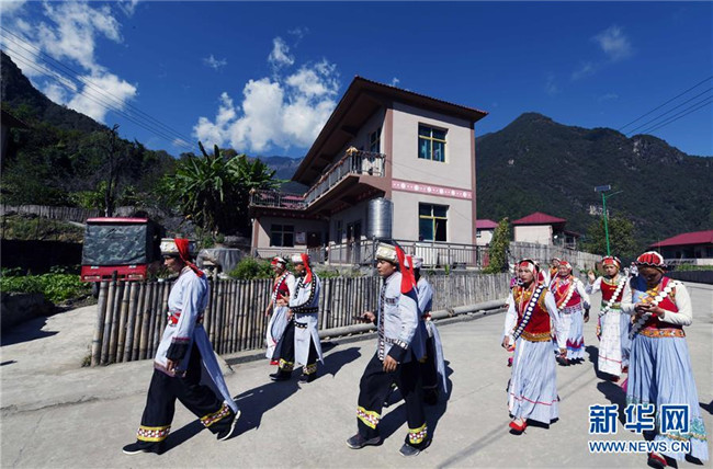 11月2日,云南福貢縣鹿馬登鄉(xiāng)干布村的傈僳族群眾行走在村里的水泥硬化路上。新華社記者 楊宗友 攝