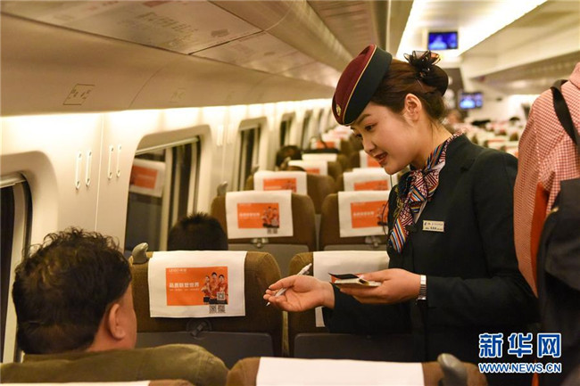 11月16日,在由烏魯木齊開往哈密的D8804次動(dòng)車組列車上,列車乘務(wù)員為旅客檢票。新華社記者 丁磊 攝