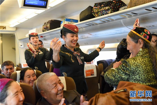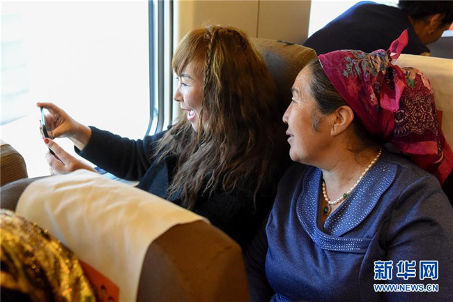 11月16日,在D8804次動(dòng)車組列車上,乘務(wù)員和乘客跳起舞慶祝蘭新高鐵新疆段開通運(yùn)營(yíng)五周年。新華社記者 丁磊 攝