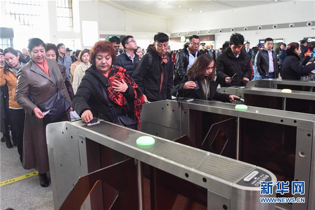 11月16日,乘坐D8803次動(dòng)車組列車的乘客在吐魯番北站檢票進(jìn)站。新華社記者 丁磊 攝