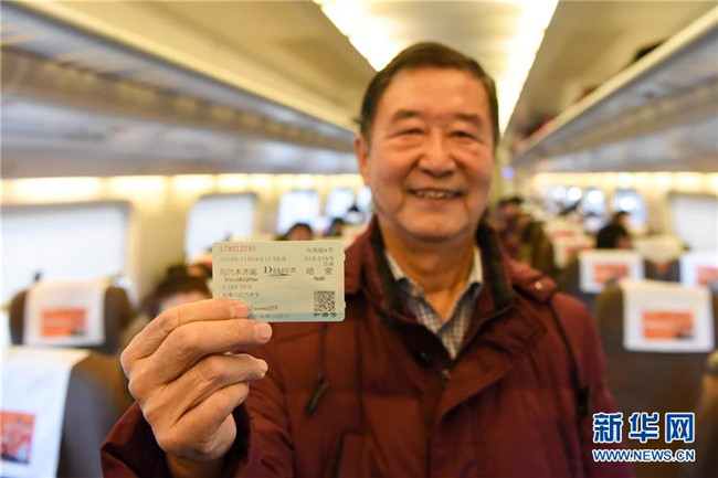 11月16日,在D8804次動(dòng)車組列車上,乘客張長(zhǎng)齡展示2014年11月16日蘭新高鐵新疆段開通的首趟列車車票。新華社記者 丁磊 攝