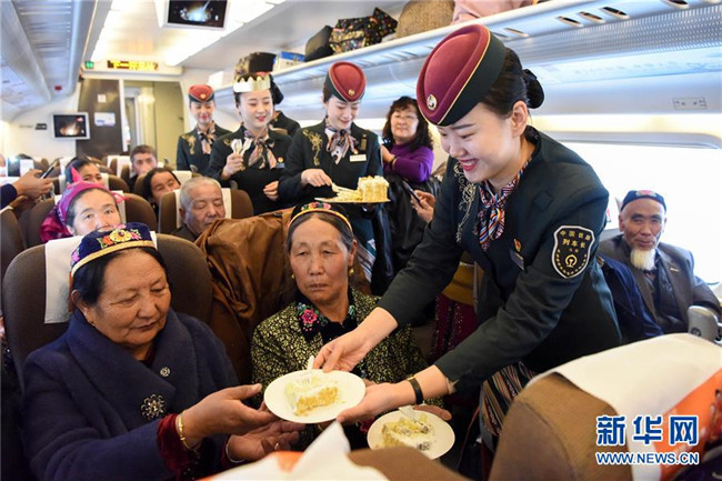 11月16日,在D8804次動(dòng)車組列車上,乘務(wù)員為乘客送上蘭新高鐵新疆段開通運(yùn)營(yíng)五周年的“生日”蛋糕。新華社記者 丁磊 攝