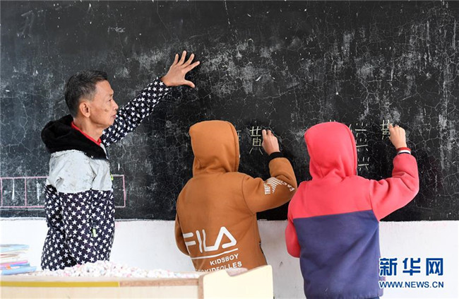11月19日,在廣西上思縣那琴鄉(xiāng)中心小學(xué)逢通村教學(xué)點,梁志雄教兩名學(xué)生寫字。新華社記者陸波岸攝