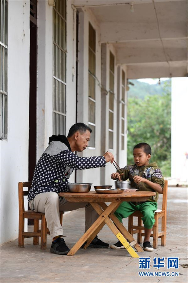 11月19日,在廣西上思縣那琴鄉(xiāng)中心小學(xué)逢通村教學(xué)點,梁志雄和一名學(xué)生吃午飯。新華社記者陸波岸攝
