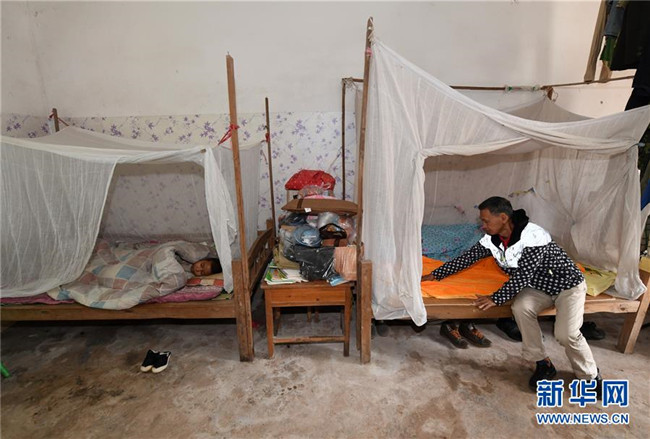 11月19日,在廣西上思縣那琴鄉(xiāng)中心小學(xué)逢通村教學(xué)點,梁志雄在鋪自己的床鋪準備午休。這個房間是梁志雄的辦公室兼臥室。新華社記者陸波岸攝