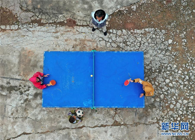 11月19日,在廣西上思縣那琴鄉(xiāng)中心小學(xué)逢通村教學(xué)點,梁志雄教學(xué)生打乒乓球(無人機拍攝)。新華社記者陸波岸攝