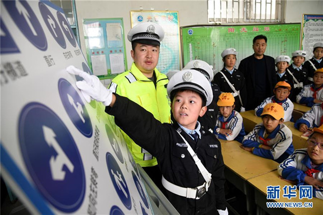 12月1日,東皋埠小學(xué)“小小交警隊(duì)”王嘉瑞(前)在為同學(xué)們介紹交通標(biāo)識(shí)。新華社記者 李紫恒攝