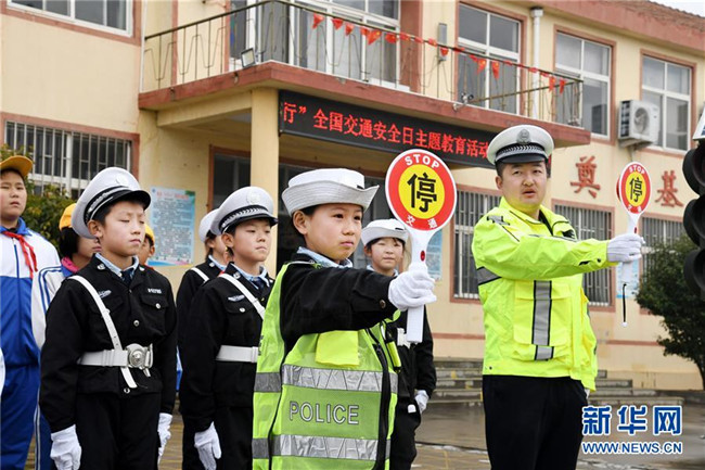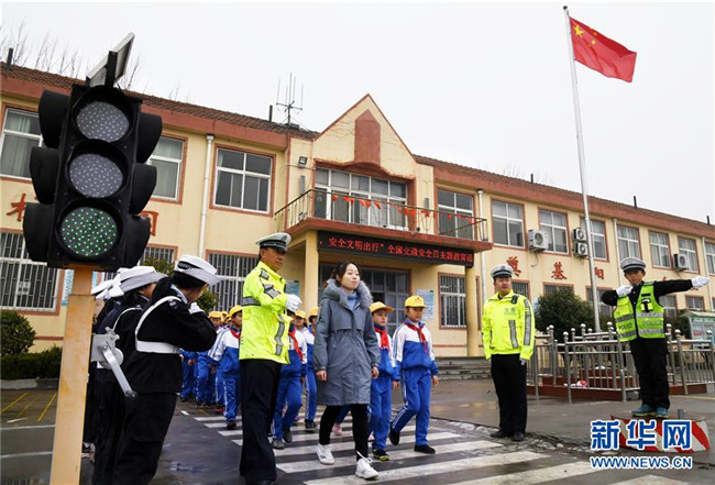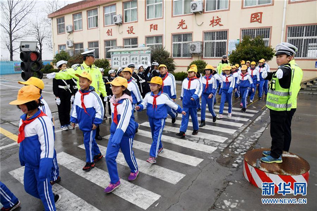 12月1日,東皋埠小學(xué)“小交警”在引導(dǎo)同學(xué)們安全通過(guò)“斑馬線”。新華社記者 李紫恒攝