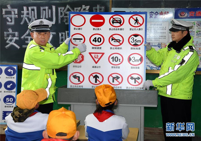 12月1日,民警劉澤春(左)在為東皋埠小學(xué)同學(xué)講解交通安全知識(shí)。新華社記者 李紫恒攝