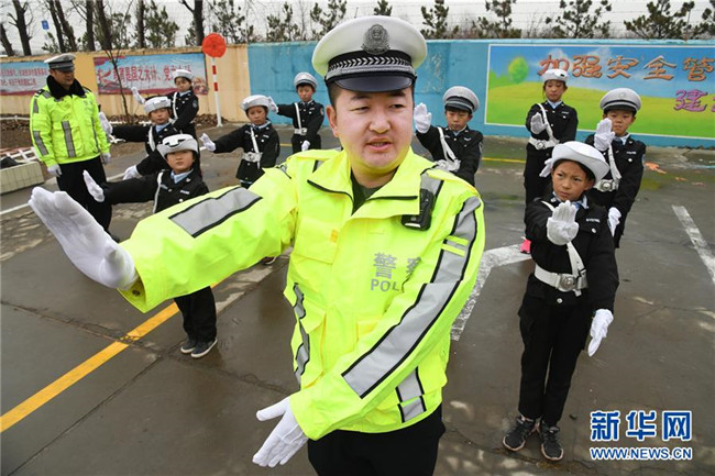 12月1日,東皋埠小學(xué)“小小交警隊(duì)”的隊(duì)員在學(xué)習(xí)交通指示手勢(shì)。新華社記者 李紫恒攝