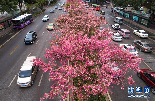 這是美麗異木棉花競相綻放的廣西柳州市東環(huán)大道(12月1日無人機拍攝)。新華社記者 黃孝邦 攝