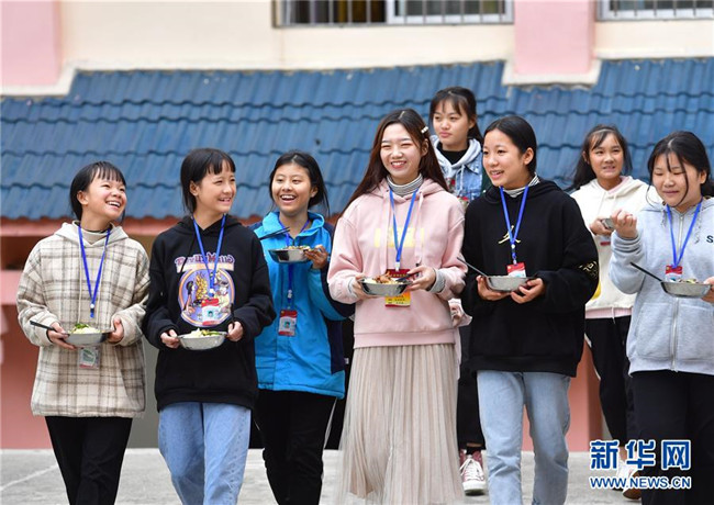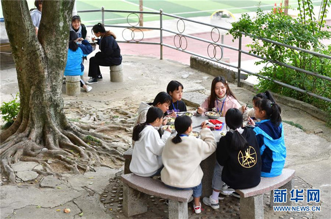 12月5日,在廣西融水苗族自治縣保桓中學,林洋港(正面,右一)和學生們在校園里吃午飯。林洋港是西北工業(yè)大學的在讀碩士研究生,今年9月來到融水苗族自治縣保桓中學任物理老師。 新華社記者 黃孝邦 攝