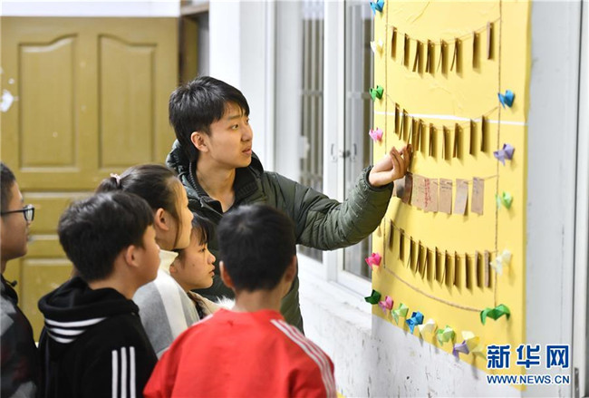 12月5日,在廣西融水苗族自治縣民族中學,郭浩坤在教室里看同學們的心愿卡。郭浩坤是西北工業(yè)大學的在讀碩士研究生,今年9月來到融水苗族自治縣民族中學,擔任物理老師。 新華社記者 黃孝邦 攝