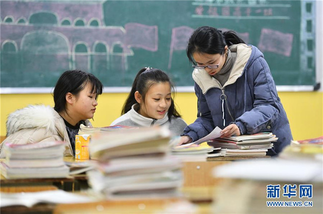 12月5日,在廣西融水苗族自治縣民族中學,胡欣怡(右)在給學生輔導功課。胡欣怡是西北工業(yè)大學的在讀碩士研究生,今年9月來到融水苗族自治縣民族中學,擔任語文老師。 新華社記者 黃孝邦 攝
