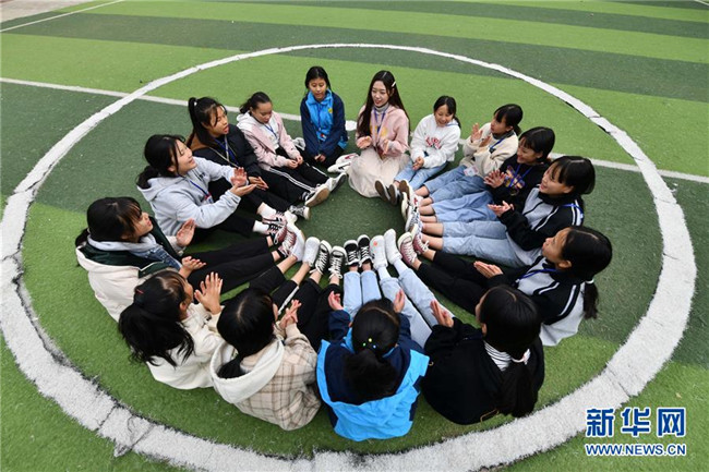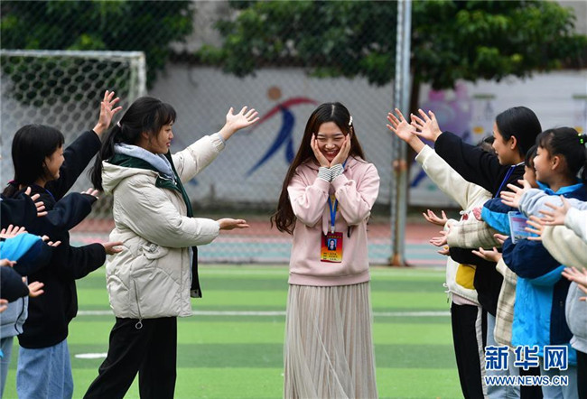 12月5日,在廣西融水苗族自治縣?;钢袑W,林洋港(右三)和學生們在球場上玩游戲。林洋港是西北工業(yè)大學的在讀碩士研究生,今年9月來到融水苗族自治縣保桓中學任物理老師。新華社記者 黃孝邦 攝