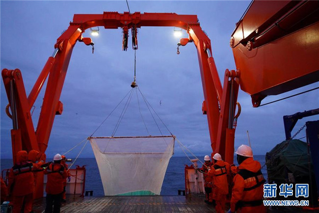 “雪龍2”號(hào)12月7日離開(kāi)南大洋普里茲灣海域向西航行,開(kāi)始對(duì)宇航員海海域展開(kāi)科考作業(yè)??瓶缄?duì)員沿著本次宇航員??瓶嫉氖讉€(gè)調(diào)查斷面,自北向南做了多個(gè)站位的CTD(海水溫鹽深測(cè)量?jī)x)采水作業(yè)、浮游生物垂直拖網(wǎng)作業(yè),以及魚(yú)類(lèi)拖網(wǎng)和箱式采樣器等采樣作業(yè)。