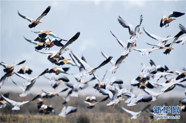 12月11日在貴州草海保護區(qū)拍攝的越冬的斑頭雁和赤麻鴨。
