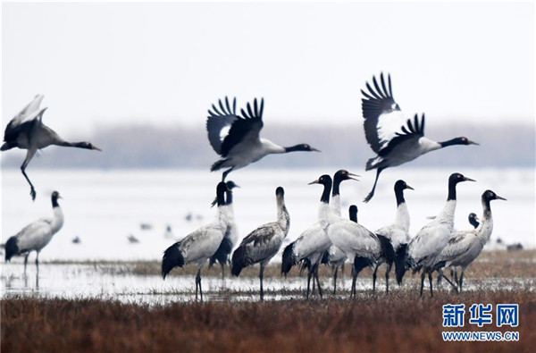 12月11日在貴州草海保護區(qū)拍攝的黑頸鶴。新華社記者楊文斌攝