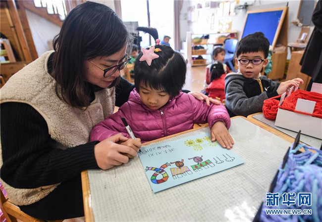 12月11日,小朋友在老師的帶領下繪制愛心卡片,準備隨圍巾一起寄給西藏的小朋友們。 新華社記者 徐昱 攝