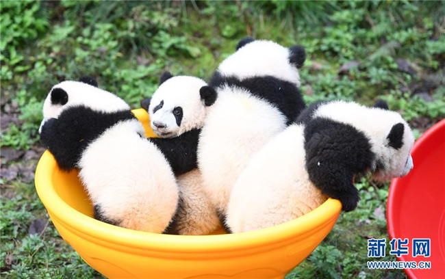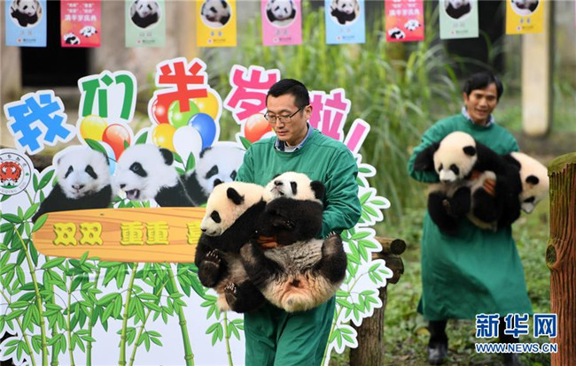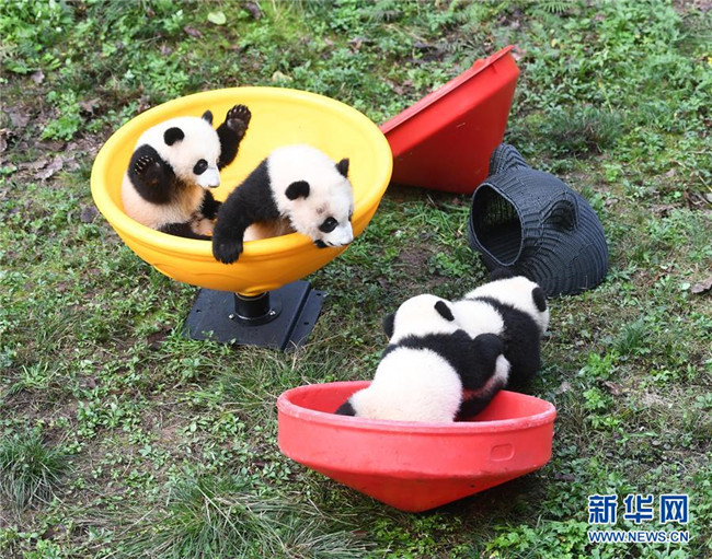 12月22日,重慶動物園4只半歲大熊貓在玩耍。當日,重慶動物園為4只大熊貓寶寶“雙雙”“重重”“喜喜”“慶慶”舉行半歲生日慶?;顒印?只半歲大熊貓在飼養(yǎng)員的照料下,在熊貓館運動場內玩耍、嬉戲,與市民游客一同過冬至。新華社記者唐奕攝