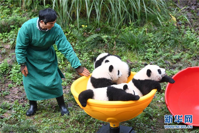 12月22日,重慶動物園4只半歲大熊貓在戶外活動。當日,重慶動物園為4只大熊貓寶寶“雙雙”“重重”“喜喜”“慶慶”舉行半歲生日慶祝活動。4只半歲大熊貓在飼養(yǎng)員的照料下,在熊貓館運動場內玩耍、嬉戲,與市民游客一同過冬至。新華社記者唐奕攝