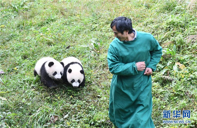 12月22日,飼養(yǎng)員引導大熊貓寶寶到戶外運動。當日,重慶動物園為4只大熊貓寶寶“雙雙”“重重”“喜喜”“慶慶”舉行半歲生日慶?;顒印?只半歲大熊貓在飼養(yǎng)員的照料下,在熊貓館運動場內玩耍、嬉戲,與市民游客一同過冬至。新華社記者唐奕攝