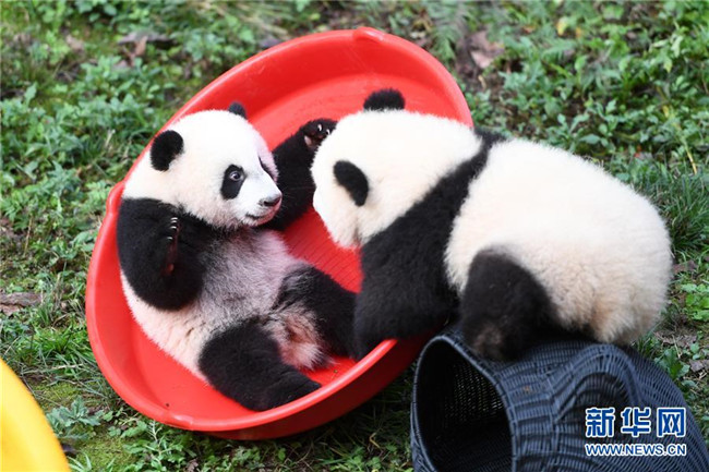 12月22日,重慶動物園兩只半歲大熊貓在玩耍。當日,重慶動物園為4只大熊貓寶寶“雙雙”“重重”“喜喜”“慶慶”舉行半歲生日慶?;顒?。4只半歲大熊貓在飼養(yǎng)員的照料下,在熊貓館運動場內玩耍、嬉戲,與市民游客一同過冬至。新華社記者唐奕攝