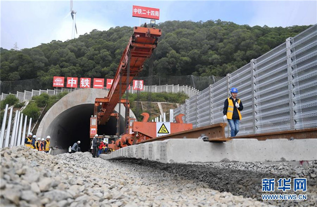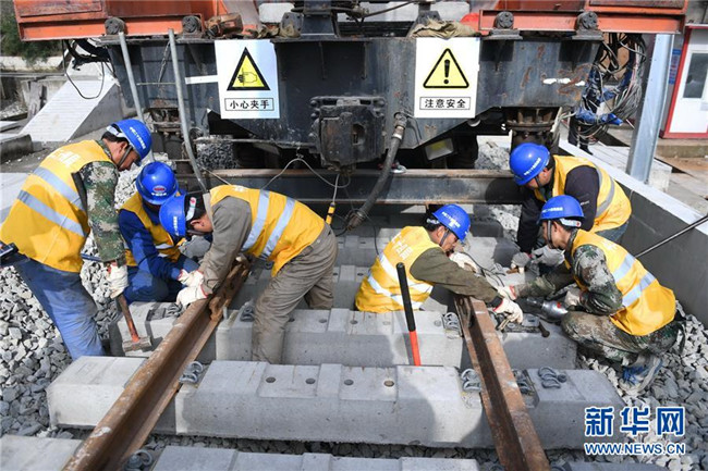 12月22日,中鐵二十四局工作人員在平潭海峽公鐵大橋鋪軌施工現(xiàn)場進(jìn)行鋪軌作業(yè)。新華社記者 林善傳 攝