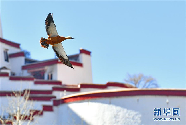 一只赤麻鴨從布達(dá)拉宮旁飛過(guò)(12月20日攝)。新華社記者 張汝鋒 攝