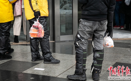 12月16日,北京通州區(qū)萬(wàn)達(dá)寫字樓門口,兩位外賣員在等待顧客取餐。見習(xí)記者 張玉佳/攝