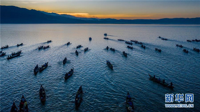 當日,位于云南省玉溪市江川區(qū)的星云湖迎來一年一度的開湖捕魚季,600余艘漁船駛?cè)胄窃坪稉啤?星云湖是云南省九大高原湖泊之一,本次開湖捕魚時間將從2019年12月25日持續(xù)至2020年1月23日。 新華社記者 胡超 攝