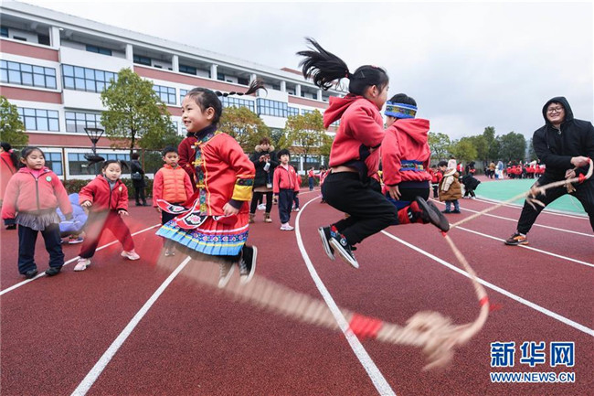 12月26日,孩子們?cè)趨⒓犹ɡK活動(dòng)。當(dāng)日,浙江省長(zhǎng)興縣李家巷鎮(zhèn)中心幼兒園舉辦“炫彩民族風(fēng)歡樂來運(yùn)動(dòng)”為主題的趣味民族游戲活動(dòng)。該幼兒園有一些孩子來自壯族、苗族、布依族等少數(shù)民族。幼兒園旨在通過這種活動(dòng),讓孩子們和家長(zhǎng)共同體驗(yàn)竹竿舞、篝火舞、擲糠包等少數(shù)民族特色游戲,了解少數(shù)民族特色文化。新華社記者徐昱攝