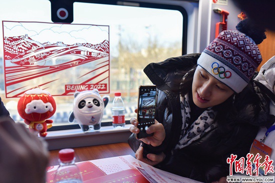 一名乘客正在拍攝2022年北京冬奧會吉祥物和車窗上的窗花。這些剪紙窗花是由張家口蔚縣剪紙藝人創(chuàng)作,包含了詹天佑畫像、京張高鐵和冰雪運(yùn)動(dòng)等元素。實(shí)習(xí)生 宋欣然/攝