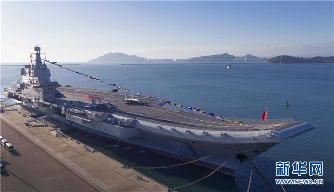 2019年12月17日,我國第一艘國產(chǎn)航空母艦山東艦在海南三亞某軍港交付海軍。經(jīng)中央軍委批準(zhǔn),我國第一艘國產(chǎn)航母命名為“中國人民解放軍海軍山東艦”,舷號為“17”。這是2019年12月15日拍攝的停靠在海南三亞某軍港的山東艦(無人機(jī)照片)。 新華社記者 李剛 攝