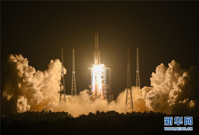 2019年12月27日20時45分,長征五號遙三運(yùn)載火箭在中國文昌航天發(fā)射場點火升空。 新華社記者陳曄華攝