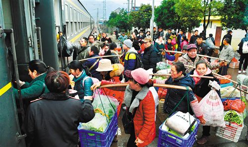 ▲停靠在湖南省麻陽郭公坪站的7272次列車,當?shù)毓r(nóng)菜農(nóng)挑著擔子準備上車。這趟“慢火車”所經(jīng)過的地區(qū)多為“老少邊窮”,經(jīng)濟欠發(fā)達。為盤活沿途百姓致富渠道,鐵路部門開“綠燈”允許乘客攜帶大量鮮活貨物乘車。